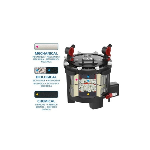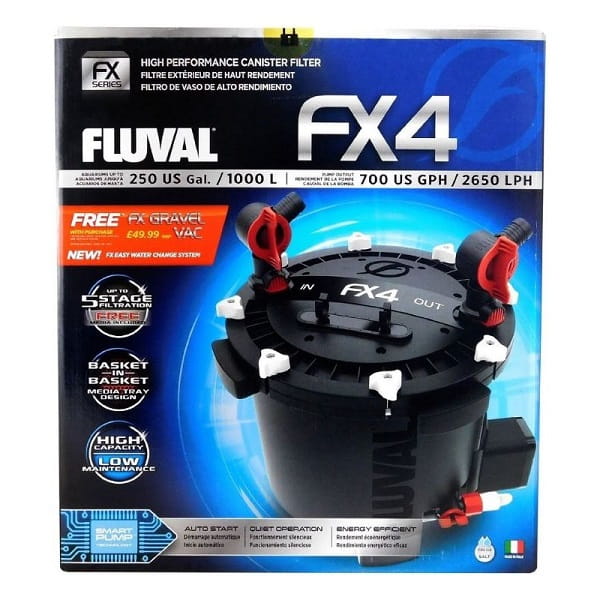 Fluval Filtr zewnętrzny kubełkowy, z serii FX4 to wielostopniowy system filtracji, w którym można rozlokować materiał filtracyjny zgodnie z potrzebami zbiornika, z którym ma współpracować. Ogromna przepustowość i potężna moc silnika zapewnia 2650 litrów przepływu na godzinę, co gwarantuje krystaliczną czystość w akwarium do 1000 litrów.