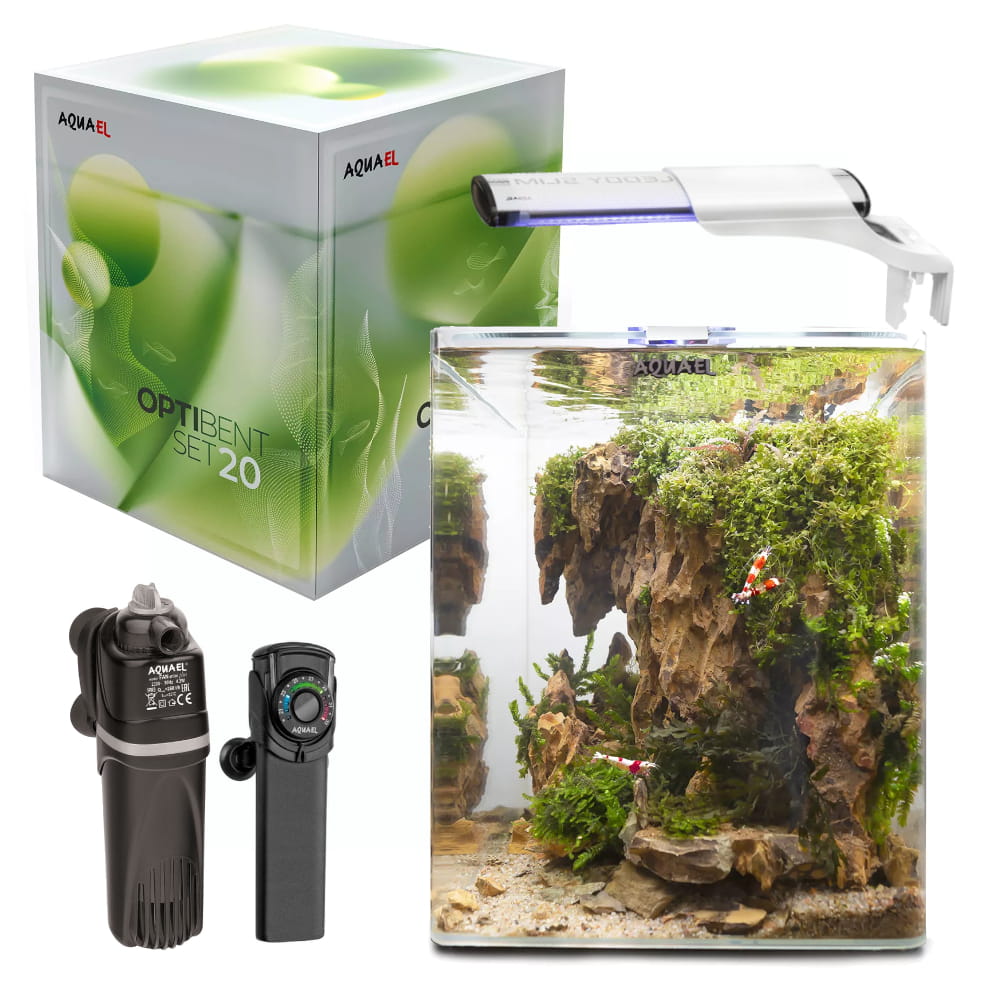 OptiBent Set to kompletny, bogato wyposażony i designerski zestaw akwarystyczny. Nano akwarium jest proste w założeniu i przede wszystkim nie potrzebuje zbyt wiele miejsca w naszym domu. Jego wymiary pozwalają na umiejscowienie go nawet na biurku czy szafce RTV. Dzięki temu wprowadzimy do domu kawałek pięknej natury nie tracąc na tym przestrzeni.