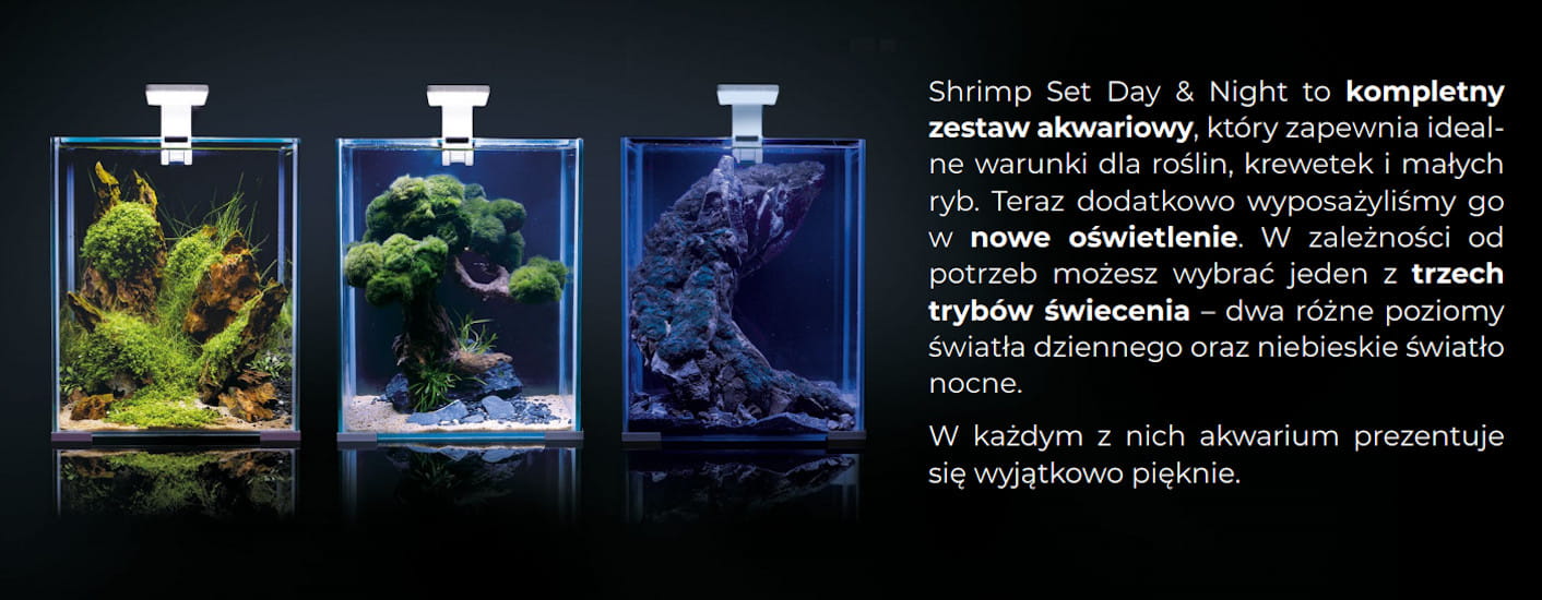 Shrimp Set Day & Night to funkcjonalny zestaw charakteryzujący się nowoczesnym, surowym designem. Akwarium wraz z pokrywą tworzy minimalistyczną, szklaną kostkę, która ze względu na swój niewielki rozmiar może stać się stylową ozdobą nawet małych pomieszczeń.