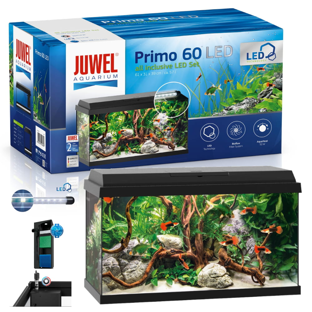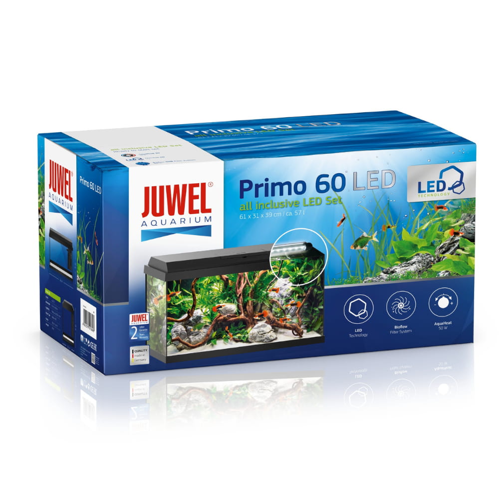 Primo 60 LED to w pełni wyposażony zestaw akwariowy zawierający odpowiednio dobrane oświetlenie, wydajny filtr oraz niezawodną grzałkę. Jest to produkt idealny na początek przygody z akwarystyką. Wymiary 61x31 cm w podstawie i objętość 60 litrów pozwalają na stworzenie podwodnego świata dla ryb i innych organizmów, przy stosunkowo kompaktowym prostokątnym kształcie.
