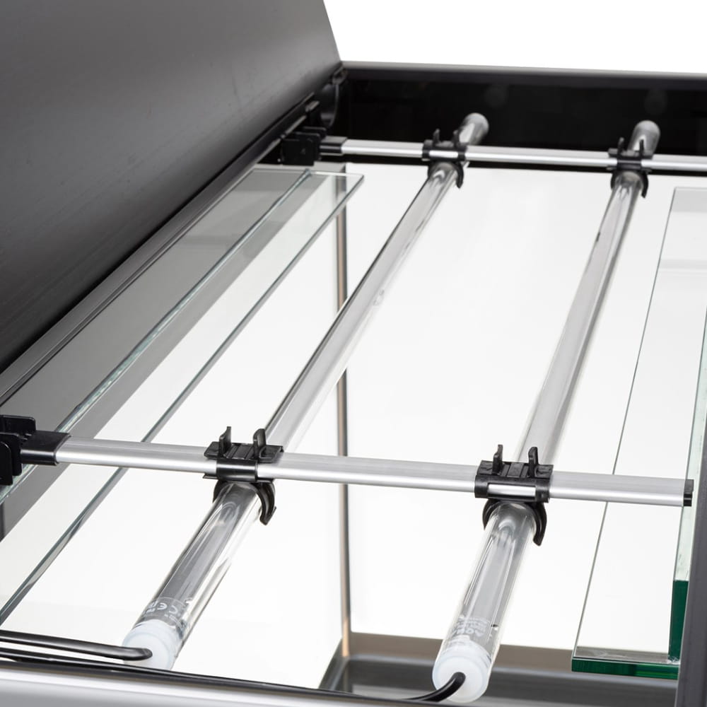 Szklany zbiornik dopełnia zintegrowana z nim pokrywa. Umieściliśmy w niej oświetlenie Aquael Leddy Tube Sunny Day&Night 2.0. Moduły świetlne są zamontowane w specjalnym stelażu.