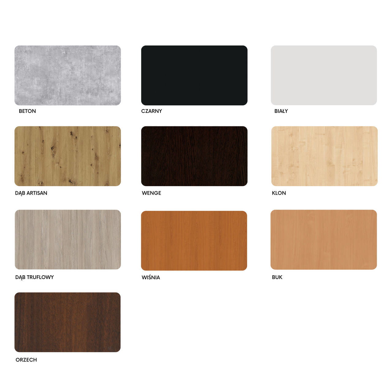 Oferujemy je w dziesięciu kolorach: klon, buk, wiśnia, truflowy, orzech, wenge, biały, beton, dąb artisan oraz czarny. Wzory płyt znajdziecie we wzorniku, który znajduje się w galerii produktu.