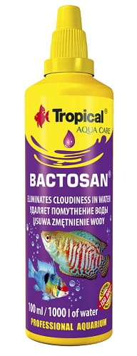 BACTOSAN usuwa zmętnienie wody po przekarmieniu ryb. Preparat przeznaczony do klarowania wody akwariowej, która uległa zmętnieniu w wyniku złego funkcjonowania filtracji lub na skutek przekarmienia ryb. Zmętnienie wody pojawia się również w nowo założonych zbiornikach z nieustaloną równowagą biologiczną. BACTOSAN szybko i skutecznie przywraca wodzie przejrzystość, co poprawia warunki życia ryb i walory estetyczne akwarium.