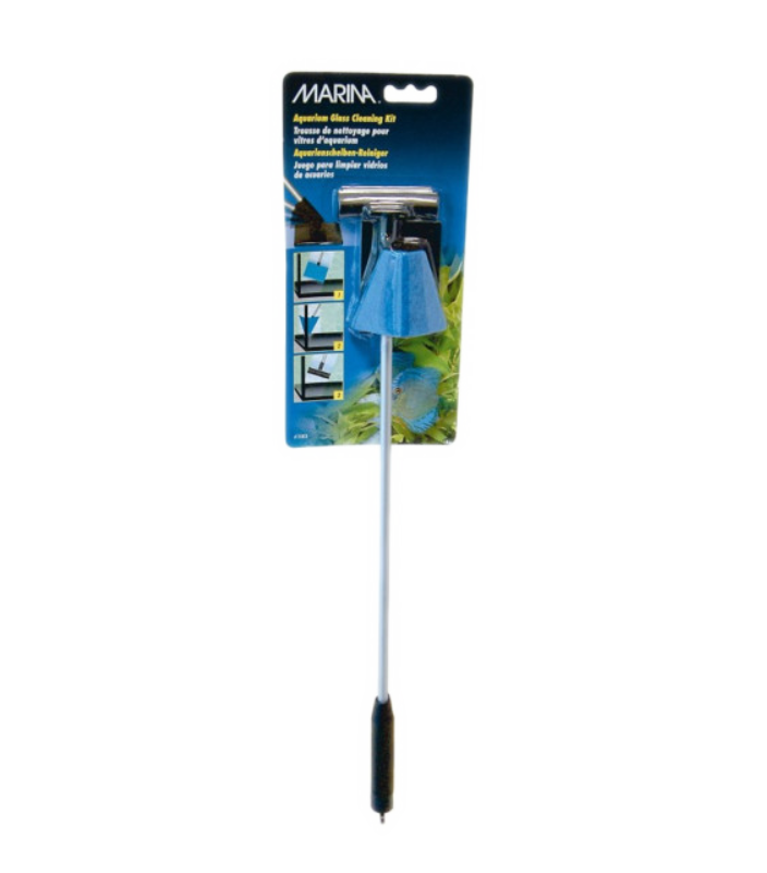 Zestaw do czyszczenia szyb w akwarium, zawiera niezbędne narzędzia, które umożliwiają czyszczenie wnętrza zbiornika bez moczenia rąk. Posiada gąbkę do usuwania i zanieczyszczeń oraz żyletkę do usuwania uporczywych glonów wraz z nasadką, która umożliwia czyszczenie narożników akwarium.