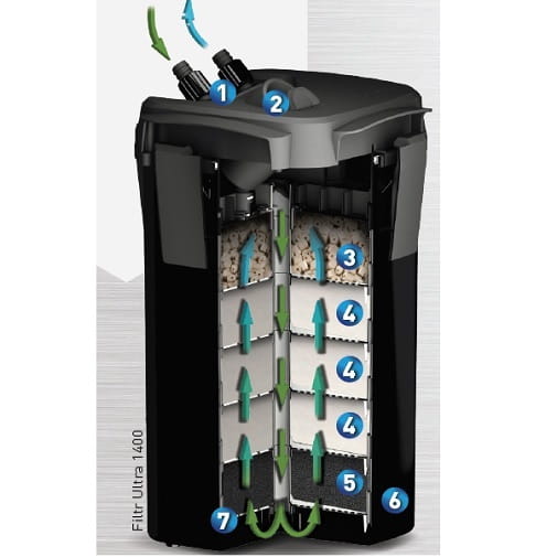 Doskonała wydajność – szybki przepływ wody przez filtr (do 1000-1400 l/h) i duża pojemność filtra (11-16 l) w połączeniu z wysoką jakością zastosowanych wkładów filtracyjnych pozwala na uzyskanie wyjątkowo wydajnej filtracji wody nawet w akwarium o pojemności 500 l. Umożliwia to stworzenie doskonałych warunków do hodowli zwierząt i roślin akwariowych. W filtrze można stosować dowolne wkłady filtracyjne (biologiczne, mechaniczne i chemiczne). Regulacja wydajności daje możliwość łatwego dostosowania przepływu do potrzeb każdego akwarium.