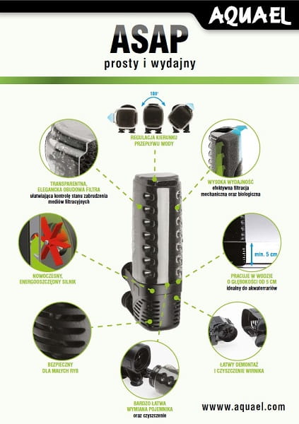 W dzisiejszych czasach dla większości z nas najbardziej deficytowym towarem jest czas. Dlatego robimy wszystko, aby oszczędzić go jak najwięcej i w tym celu poszukujemy możliwie prostych i dogodnych rozwiązań w każdej dziedzinie życia. Dotyczy to również akwarystyki, dlatego AQUAEL prezentuje zupełnie nowe, rewolucyjne wewnętrzne filtry akwariowe serii ASAP. Łączą one bardzo wysoką wydajność pracy i liczne walory użytkowe z wyjątkowo prostą konstrukcją, która do minimum skraca czas, jaki trzeba poświęcić na obsługę urządzenia.