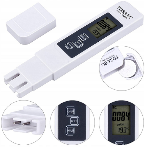 ✅ Pomiar całkowitej ilości wszelkich rozpuszczonych w wodzie substancji (ppm), przewodności (µS) oraz temperatury (°C)