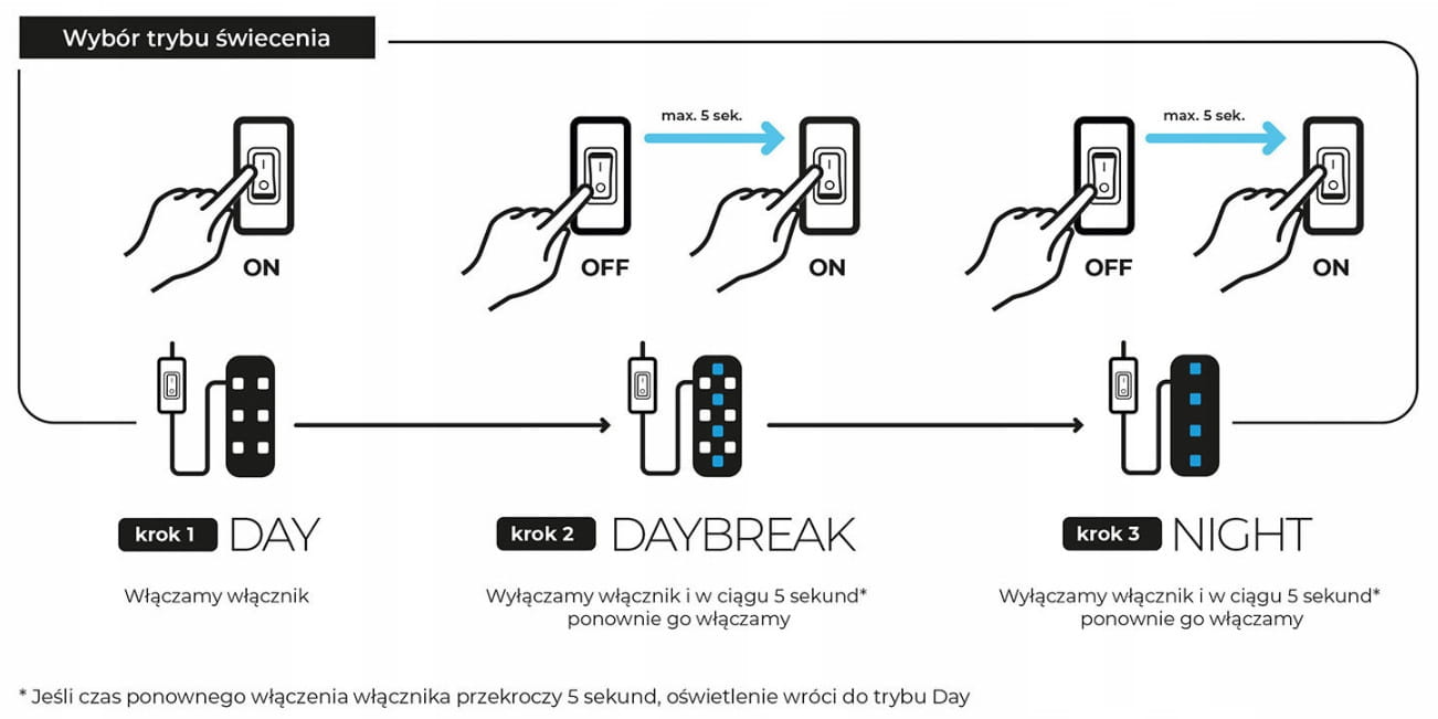 Oświetlenie DAY & NIGHT pięknie wyeksponuje aranżację w akwarium zarówno w dzień, jak i w nocy, a także sprawi, że wnętrze będzie bardziej przytulne. Zmiana trybu pracy DAY / DAYBREAK / NIGHT następuje po wyłączeniu i włączeniu modułu przełącznikiem w czasie nie dłuższym niż 5 sekund. Przełączenie bezpośrednio w tryb DAY odbywa się po wyłączeniu modułu na okres dłuższy niż 5 sekund i jego ponownym włączeniu. Najlepiej zautomatyzować ten proces stosując nowoczesny sterownik akwariowy SOCKET DUO.