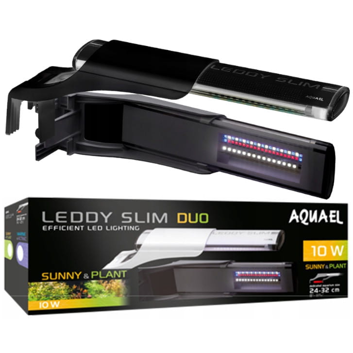 Lampa ledowa LEDDY SLIM DUO 10W SUNNY PLANT&NIGHT jest przeznaczona do oświetlania słodkowodnych zbiorników otwartych o długości od 20 do 30 cm. Zawiera dwa rzędy diod o łącznej mocy 10 W (2x5 W). Połowę stanowią diody SUNNY emitujące światło zbliżone do słonecznego (temperatura barwowa 7000 K), zaś drugą połowę diody PLANT opracowane specjalnie z myślą o potrzebach roślin (temperatura barwowa 9000 K). Lampa doskonale odwzorowuje barwy wnętrza zbiornika i wspomaga szybki, niezakłócony wzrost roślin. Idealnie sprawdza się w niedużych akwariach roślinnych oraz krewetkariach. Jej płaski, futurystyczny kształt i modny, czarny kolor sprawiają że doskonale komponuje się z nowoczesnymi zbiornikami akwariowymi i świetnie wygląda w każdym wnętrzu. Poza tym jest uniwersalna – można ją instalować również na zbiornikach o niestandardowych rozmiarach.