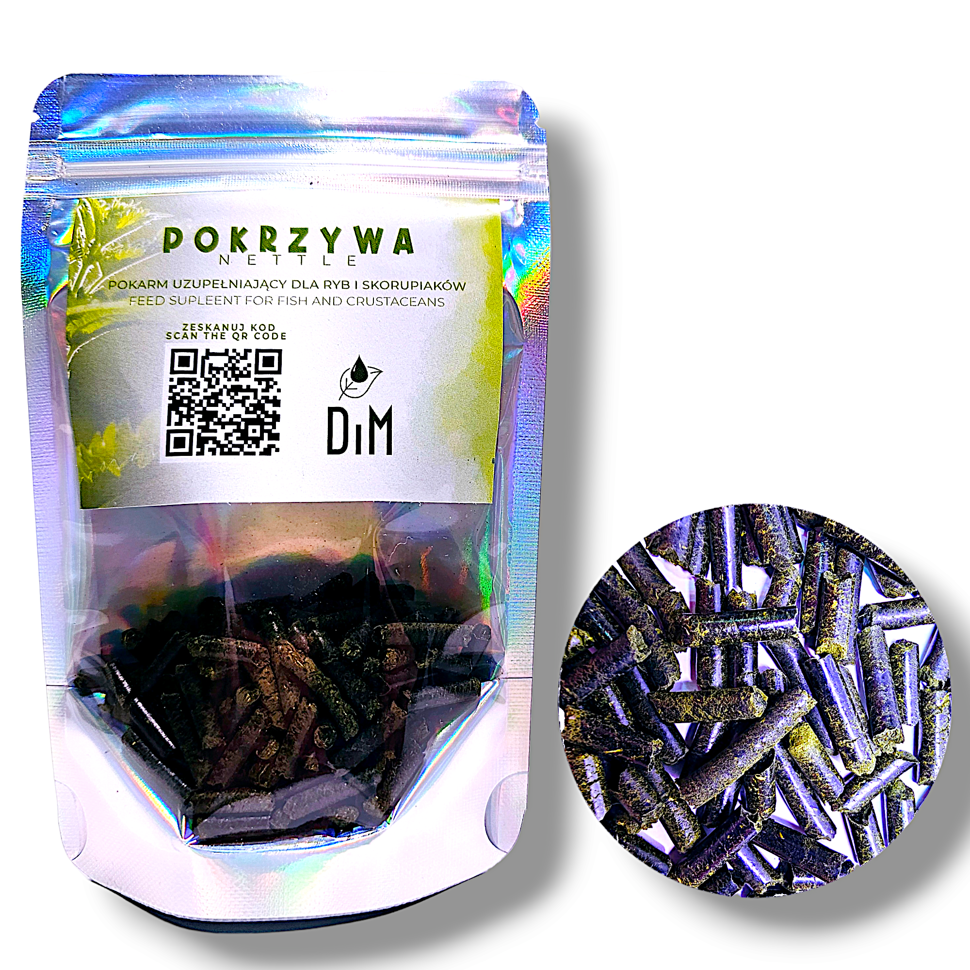 Naturalny pokarm zawierający 100% pokrzywy zwyczajnej (Urtica Dioica). Niezwykle bogaty między innymi w witaminy: A,C,K2 oraz B, składniki mineralne tj.: cynk, żelazo, mangan, fosfor oraz wapń, garbniki, flawonoidy. Polecany dla krewetek słodkowodnych, raków, ślimaków oraz ryb. Sprawdzi się zarówno w przypadku karmienia dorosłych jak i młodych osobników. Pokarm szybko tonący i wygodny w porcjowaniu. Średnica pałeczek 4 mm długość 1-2 cm.