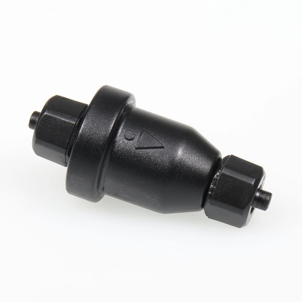 Dopóki CO2 jest tłoczony wężem doprowadzającym CO2 do akwarium, nie ma żadnego niebezpieczeństwa, że woda akwariowa wniknie do tego węża. Ale jeżeli zawór magnetyczny przerwie podawanie CO2 w nocy lub butla CO2 jest pusta, pozostały CO2 znajdujący się w wężu będzie rozpuszczać się w wodzie i tak woda akwariowa będzie coraz dalej wnikać do tego węża. Jeżeli dotrze ona do wyposażenia technicznego jak zawór magnetyczny lub reduktor ciśnienia, może tam doprowadzić do korozji (rdzy) i zniszczyć ten osprzęt techniczny. Zawór zwrotny działa jak typowy zawór, który przepuszcza gaz CO2 tylko pod ciśnieniem w jednym kierunku (kierunek strzałki na obudowie).