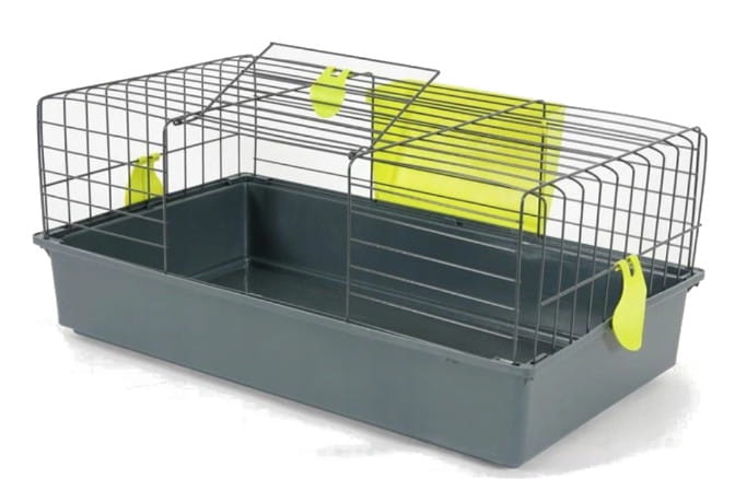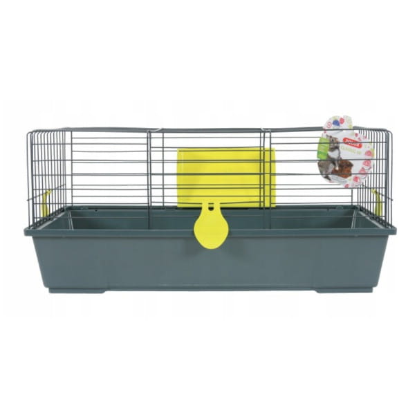 Na jednym z dłuższych boków klatki znajdują się drzwiczki wejściowe, natomiast na drugim zawieszony jest wykonany z seledynowego plastiku paśnik, przeznaczony na siano, będące niezbędnym składnikiem diety królików i świnek morskich.