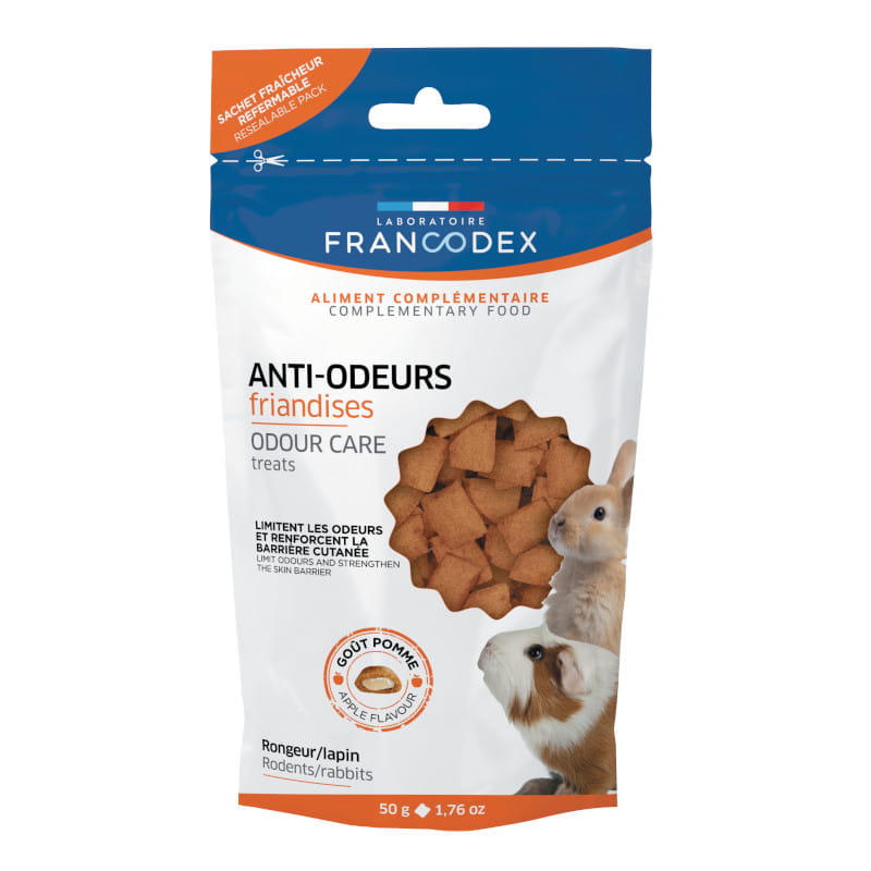 PRZEKĄSKI ZAPOBIEGAJĄCE NIEPRZYJEMNYM ZAPACHOM FRANCODEX zawierają jukę ograniczającą nieprzyjemny zapach moczu i trawienia, a także drożdże piwne wzmacniające barierę skórną i ograniczające nieprzyjemne zapachy z sierści zwierzęcia. Chrupiąca skórka i miękki miąższ sprawiają, że przekąski kojarzą się zwierzętom z przyjemnie spędzonym wspólnym czasem.