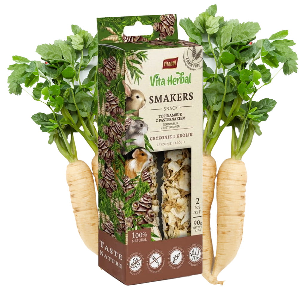 Suszone bulwy topinamburu są najcenniejszym źródłem inuliny - cukru, który w sposób naturalny obniża poziom gluzkozy we krwi, polecany wszystkim gatunkom zwierząt. Wspiera również układ trwienny oraz nerwowy. A do tego jest niesamowicie smakowity i chętnie zjadany przez zwierzęta. Pasternak jest bogaty w minerały i witaminy oraz ma właściwości oczyszczające organizm. Smakers Vita Herbal to samo zdrowie, a jego twarda struktura dodatkowo pielęgnuje ząbki, wspierając ich regularne ścieranie.