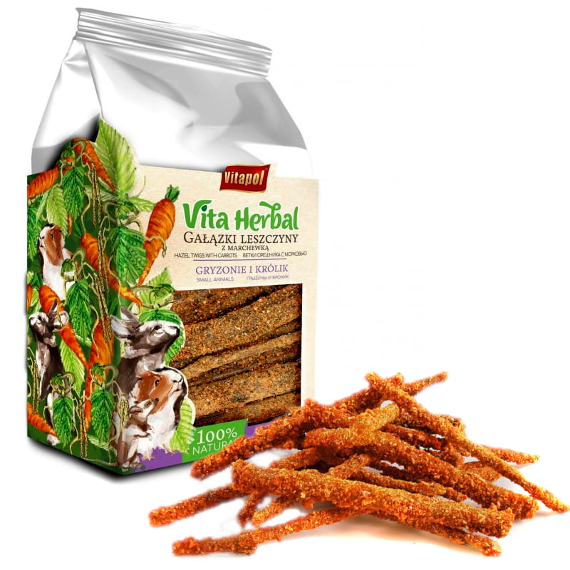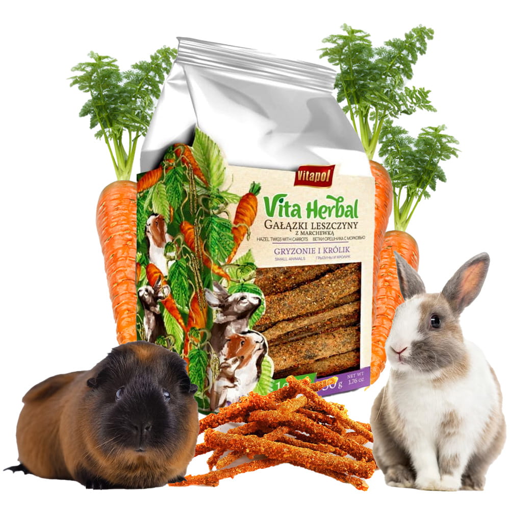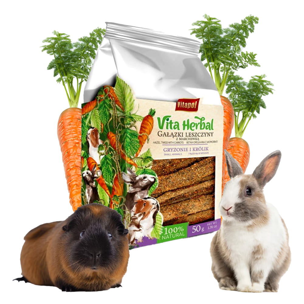 Gałązki leszczyny z marchewką dla gryzoni i królika pozwoli na urozmaicenie codziennego menu. Leszczyna jest doskonałym gryzakiem, wspomagającym ścieranie siekaczy gryzoni i królików. Otulona smakowitą marchewką stanowi przysmak, któremu nie da się oprzeć!