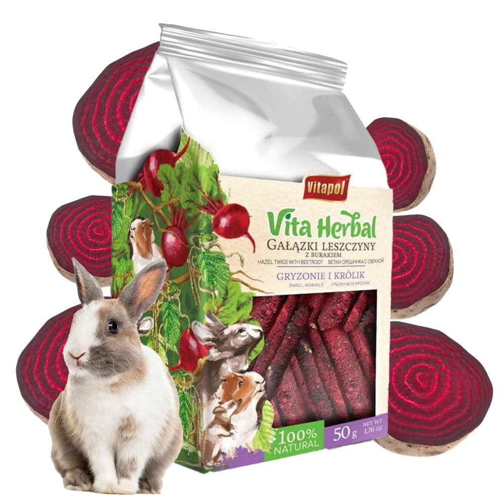Gałązki leszczyny z burakiem dla gryzoni i królika pozwoli na urozmaicenie codziennego menu. Leszczyna jest doskonałym gryzakiem, wspomagającym ścieranie siekaczy gryzoni i królików. Otulona smakowitym burakiem stanowi przysmak, któremu nie da się oprzeć!
