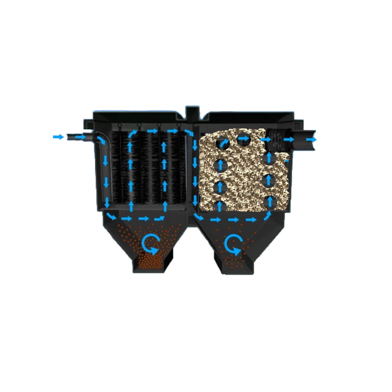 Pompa z sadzawki tłoczy wodę do pierwszego modułu, gdzie zostaje skierowana do dolnej części. Tutaj strumień wody wyhamowuje i wytrącają się najgrubsze zanieczyszczenia. Dolna cześć każdej komory spełnia rolę osadnika, z którego osad można łatwo usunąć otwierając zawór umiejscowiony w najniższej części modułu. Następnie woda spokojnie przechodzi do górnej części zbiornika, gdzie są specjalne szczotki filtracyjne, wyglądem przypominające te do mycia butelek. Działają one głównie w sposób mechaniczny wyłapując grubsze zawiesiny.
