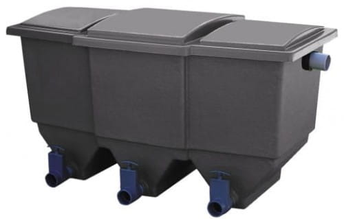 Filtry BIOklar dostępne są także w wersji grawitacyjnej, w której woda ze stawu napływa do filtra pod wpływem siły grawitacji i po przefiltrowaniu przez wszystkie materiały jest wypompowywana z ostatniej komory.