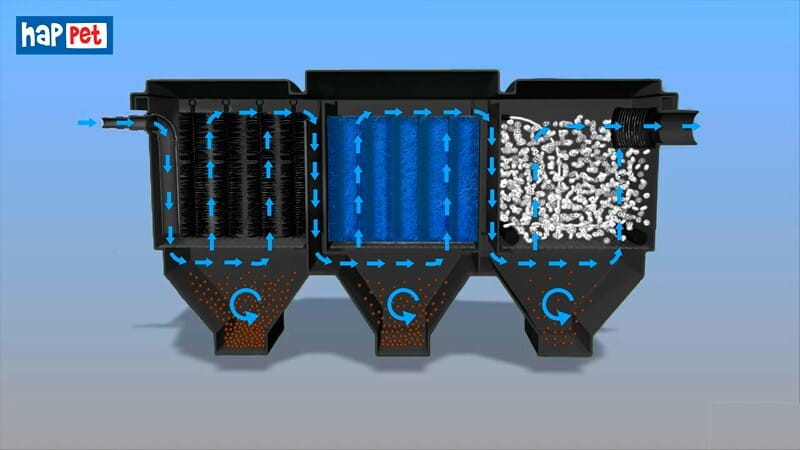 Pompa z sadzawki tłoczy wodę do pierwszego modułu, gdzie zostaje skierowana do dolnej części. Tutaj strumień wody wyhamowuje i wytrącają się najgrubsze zanieczyszczenia. Dolna cześć każdej komory spełnia rolę osadnika, z którego osad można łatwo usunąć otwierając zawór umiejscowiony w najniższej części modułu. Następnie woda spokojnie przechodzi do górnej części zbiornika, gdzie są specjalne szczotki filtracyjne, wyglądem przypominające te do mycia butelek. Działają one głównie w sposób mechaniczny wyłapując grubsze zawiesiny. Szczotki pełnią w filtrze bardzo ważną funkcję - wyłapują grubsze zanieczyszczenia. Ze względu właśnie na tą funkcję, szczotki powinny być umieszczane w filtrze jako pierwsza warstwa filtracyjna. Wstępne oczyszczenie wody mechanicznie jest bardzo ważne - polega na stworzeniu komfortowych warunków bakteriom, rozkładającym szkodliwe związki azotu w następnym po szczotkach złożu biologicznym znajdującym się w filtrze.