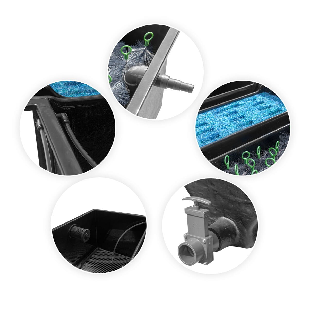 Filtr zapewnia odpowiednią powierzchnię biologicznie czynną co jest kluczowe w utrzymaniu czystej, klarownej wody, oraz utrzymania odpowiedniej równowagi biologicznej w stawie nawet przy dużej obsadzie ryb.