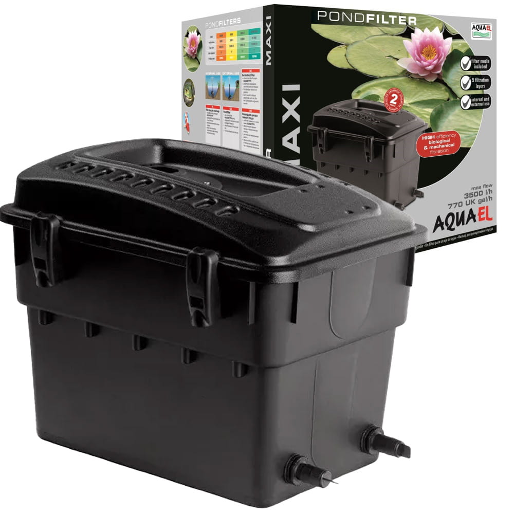 Filtr Aquael Maxi 1 to w pełni wyposażony filtr do oczka wodnego, idealny dla oczek do 9000 litrów. Zapewnia kompletną filtrację biologiczną i mechaniczną, usuwając zanieczyszczenia i glony, co gwarantuje czystą i zdrową wodę w oczku wodnym przez cały rok. Filtr Aquael Maxi 1 może być używany w zanurzeniu lub na zewnątrz oczka, a jego wymiary wynoszą 520x390x400 mm.