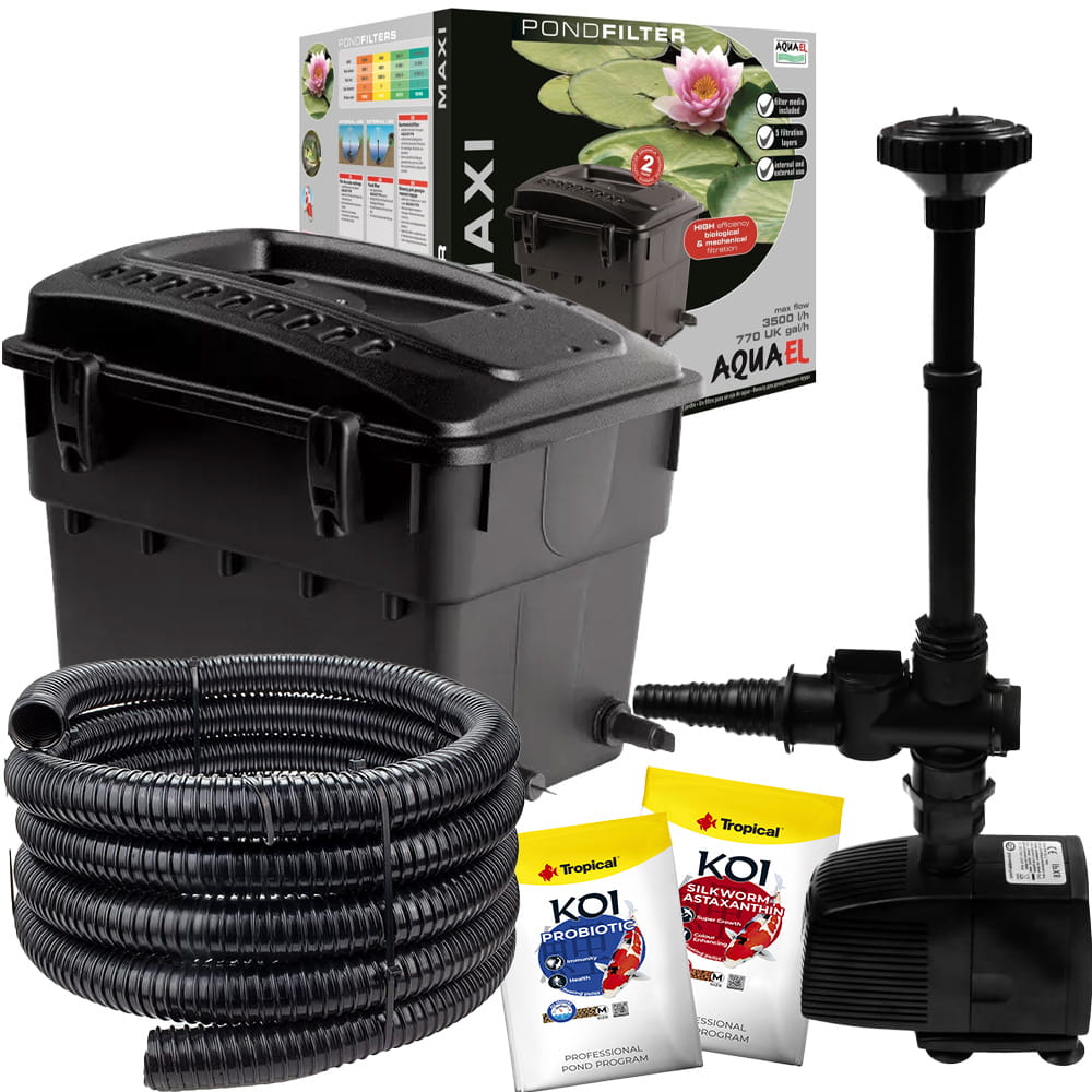 Kompletny zestaw filtracyjny Aquael Maxi 1 do oczka wodnego (do 10 000 L) – idealne rozwiązanie do efektywnej filtracji wody w oczku wodnym. Zawiera filtr Aquael Maxi 1 z pełnym wyposażeniem filtracyjnym, pompa Aqua Nova NP-3000 o wydajności 3000 l/h, zestaw dysz fontannowych oraz wąż karbowany 3m.