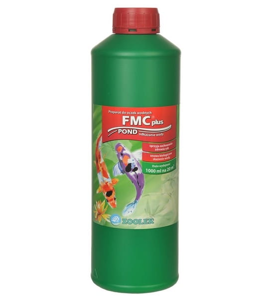 Zoolek FMC Pond 1L - uniwersalny preparat leczniczy i odkażający wodę w oczku wodnym. Trzy składniki aktywne: błękit metylenowy, zieleń malachitowa i aldehyd mrówkowy. Leczy ospę, pleśniawkę i infekcje bakteryjne. Dawka: 50ml na 1000L wody. Opakowanie 1L wystarczy na 20 000L wody.