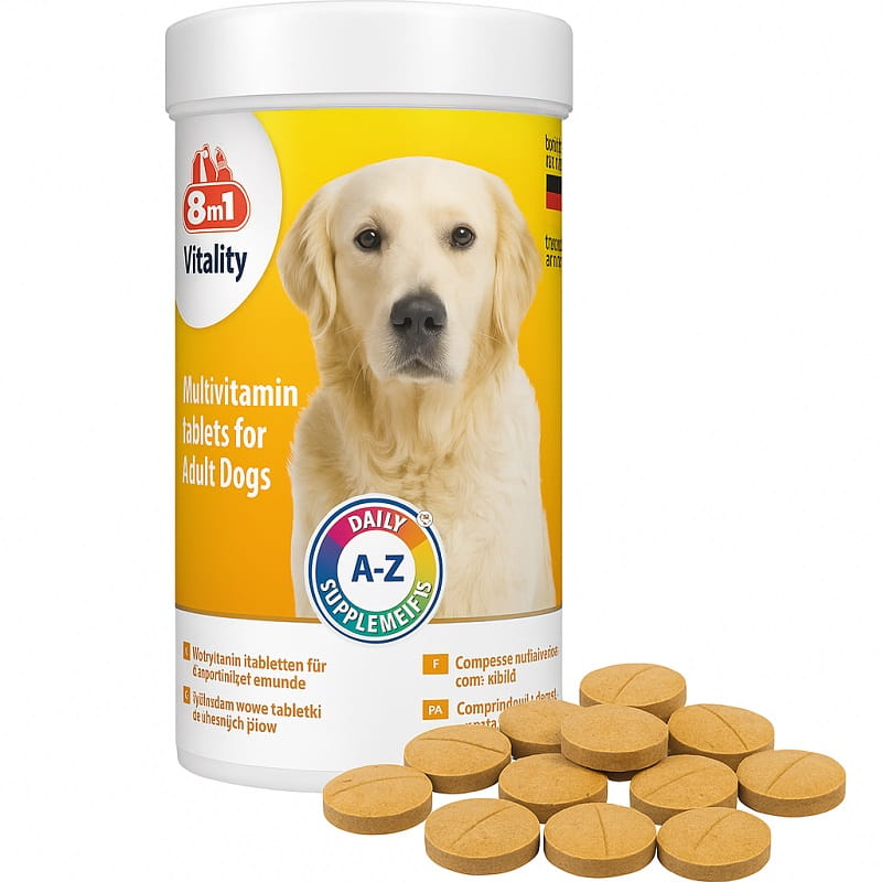 Witaminy 8in1 Vitality dla dorosłych psów to kompleks 9 witamin i 5 minerałów wspierający odporność, energię i zdrową sierść. Zawiera stabilizowaną witaminę C i naturalne przeciwutleniacze. Bez sztucznych konserwantów.