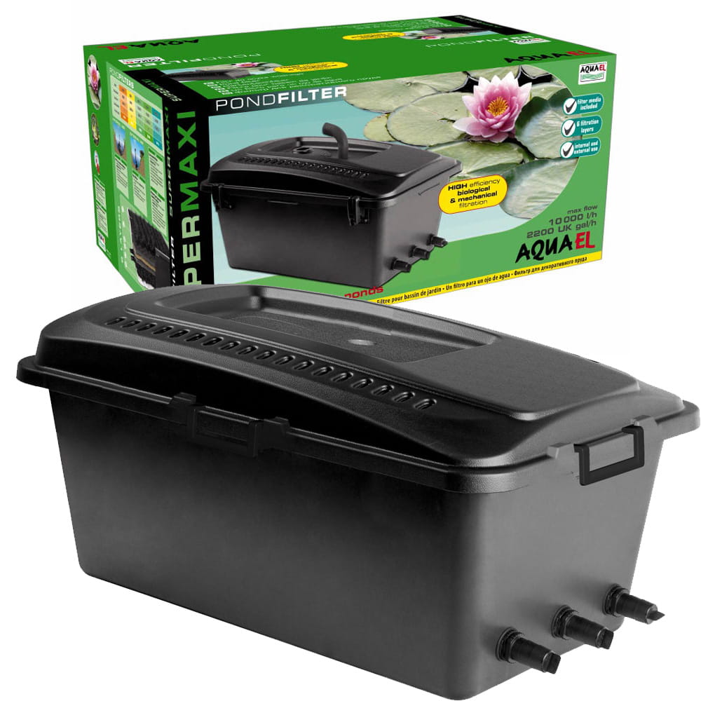 Aquael Super Maxi to kompletny filtr przepływowy z lampą UV-C 36 W i wydajną pompą fontannową o maksymalnym przepływie 10 000 l/h. Idealny do oczek wodnych o pojemności do 25 000 litrów. Zapewnia skuteczną filtrację mechaniczną i biologiczną, eliminując glony, bakterie i inne zanieczyszczenia, jednocześnie zachowując stabilność biologiczną wody.