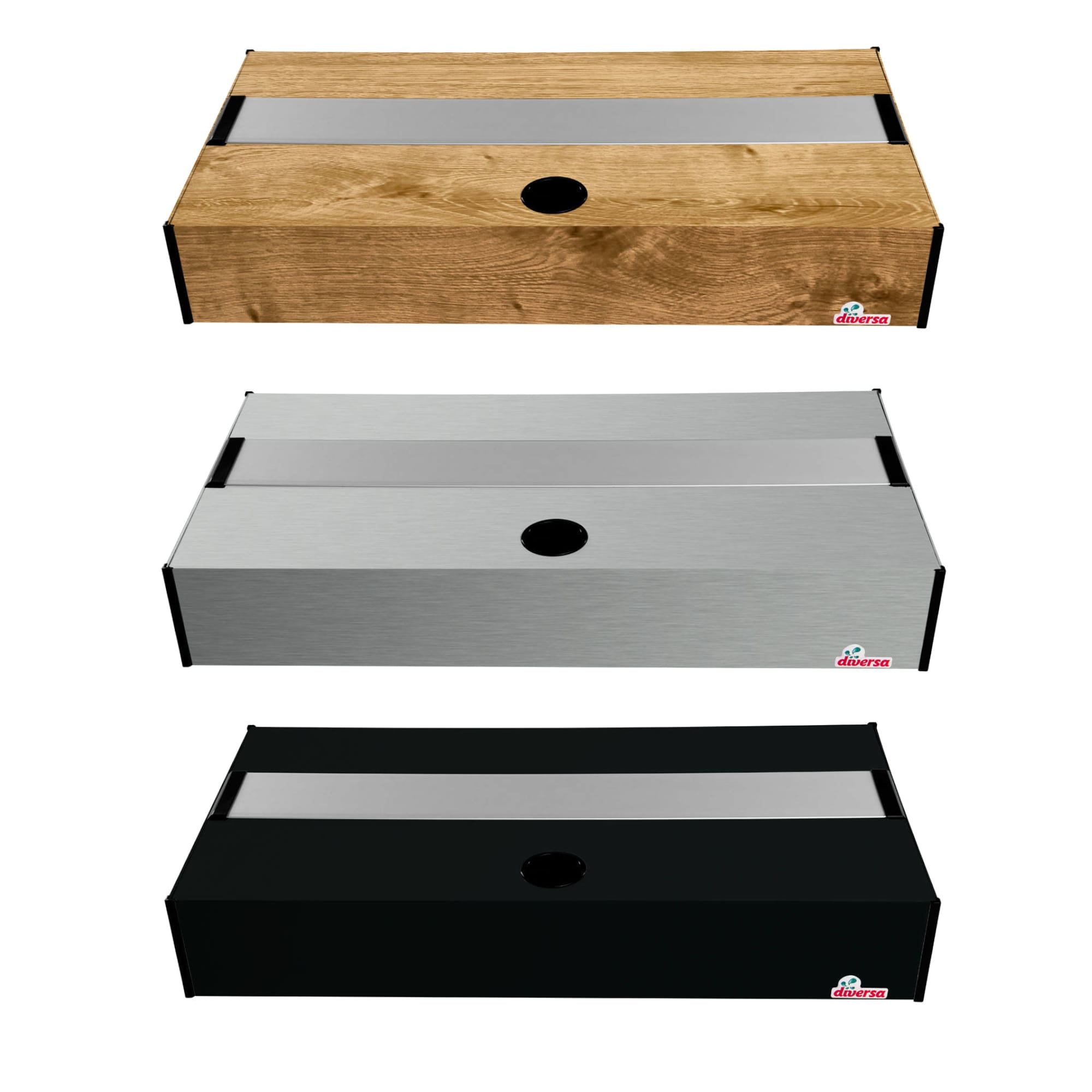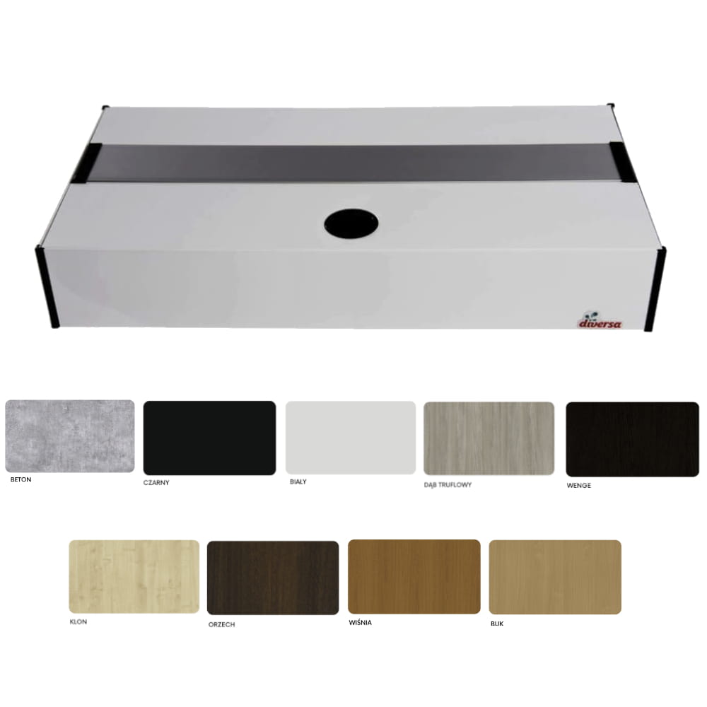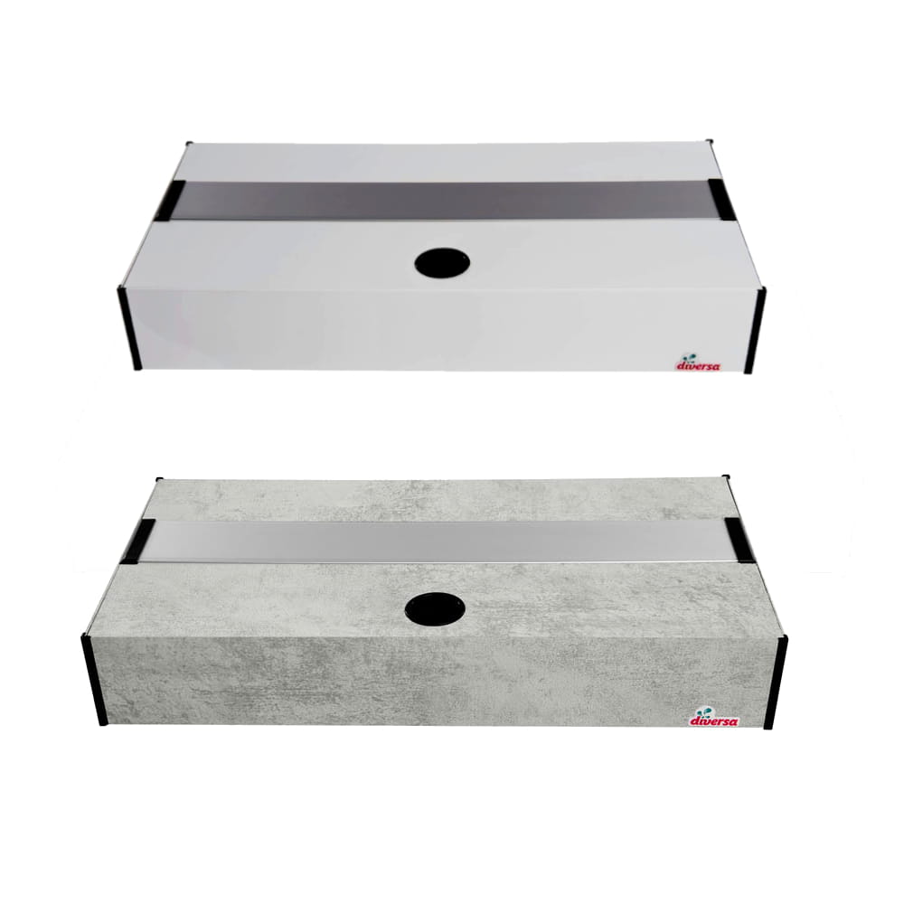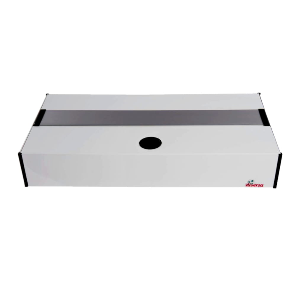 Pokrywa aluminiowa marki Diversa to produkt najwyższej jakości, wykonany ze specjalnie zaprojektowanych profili. Aluminium cechuje trwałość i wytrzymałość w związku z czym jest to surowiec świetnie sprawujący się w akwarystyce. Pokrywa Platino posiada system klapek wykonanych z tworzywa. Ułatwiają one utrzymanie akwarium w czystości bez potrzeby zdejmowania całej pokrywy. Liczba klap różni się w zależności od rozmiaru produktu. Pokrywy aluminiowe posiadają również dyskretnie umieszczony otwór, który pozwala na zamontowanie potrzebnego osprzętowania. Całość zwieńczają narożniki zabezpieczające brzegi pokrywy. Wysokość całkowita pokrywy to 10cm, z czego 17mm nachodzi na akwarium.