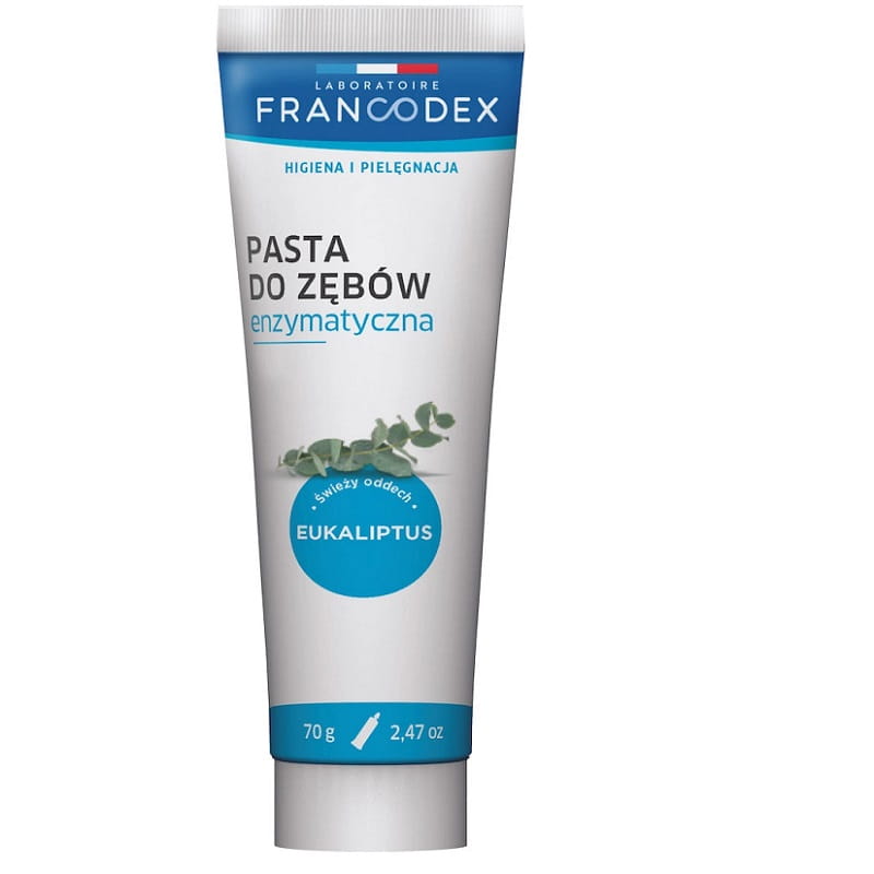 Regularne szczotkowanie zębów, dzięki ENZYMATYCZNEJ PAŚCIE DO ZĘBÓW FRANCODEX, zapobiega odkładaniu się płytki nazębnej i kamienia, zwalcza nieprzyjemny zapach i usuwa resztki jedzenia. Połączenie enzymów i granatu, który jest źródłem witaminy C, ogranicza obecność bakterii a co za tym idzie, powstawanie płytki nazębnej i kamienia. Węglan wapnia, posiadający łagodne właściwości ścierne, zapewnia prawidłowe czyszczenie, a jednocześnie nie powoduje uszkodzenia szkliwa zębów. Aby zapobiec osadzaniu się kamienia nazębnego i ograniczyć problemy w obrębie jamy ustnej zwierzęcia, należy regularnie dbać o jego zęby już od najmłodszych lat.