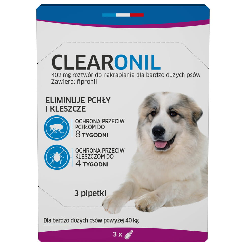 CLEARONIL Laboratoire Francodex to krople przeciwko pchłom i kleszczom, które zapewnią psu skuteczną ochronę przed inwazją tych pasożytów niezależnie od ich stadium rozwoju. Produkt w formie kropli spot-on w jednodawkowych pipetach znacznie ogranicza ryzyko przedawkowania. Zawiera fipronil, związek chemiczny, który skutecznie eliminuje pchły i kleszcze. .