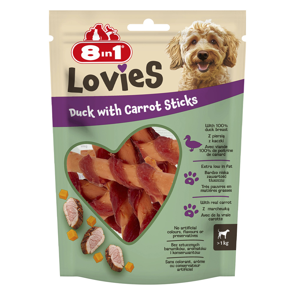 8in1, 8in1 Lovies, przysmaki dla psa, kaczka dla psa, przysmak z marchewką, bezzbożowe przysmaki dla psa, pałeczki mięsne dla psa, gryzaki dla psów, karma uzupełniająca dla psa, przekąski dla psa bez glutenu, 4048422199007