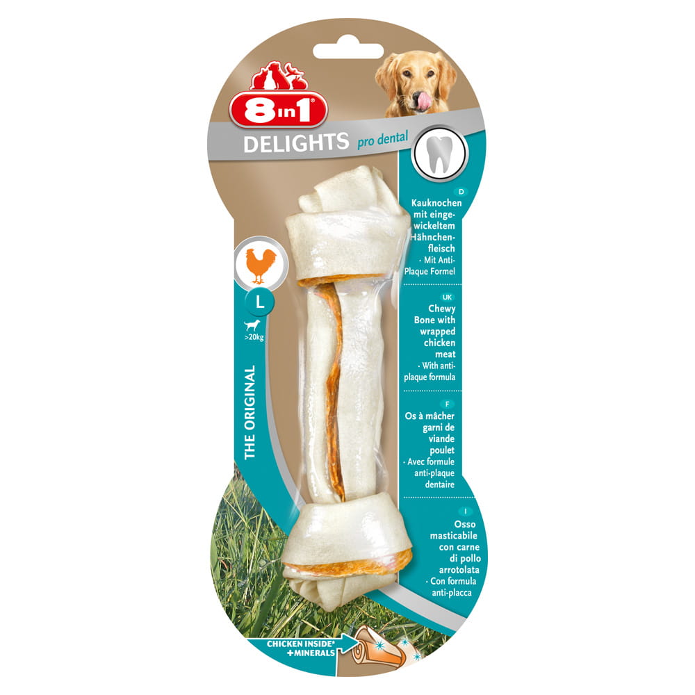 8in1 Delights Pro Dental to unikalne połączenie środka do pielęgnacji zębów, gryzaka oraz wyśmienitego przysmaku. Zawierają dużą porcję smacznego mięsa z kurczaka owiniętą twardą skórą wołową - z dodatkiem minerałów czyszczących zęby.
