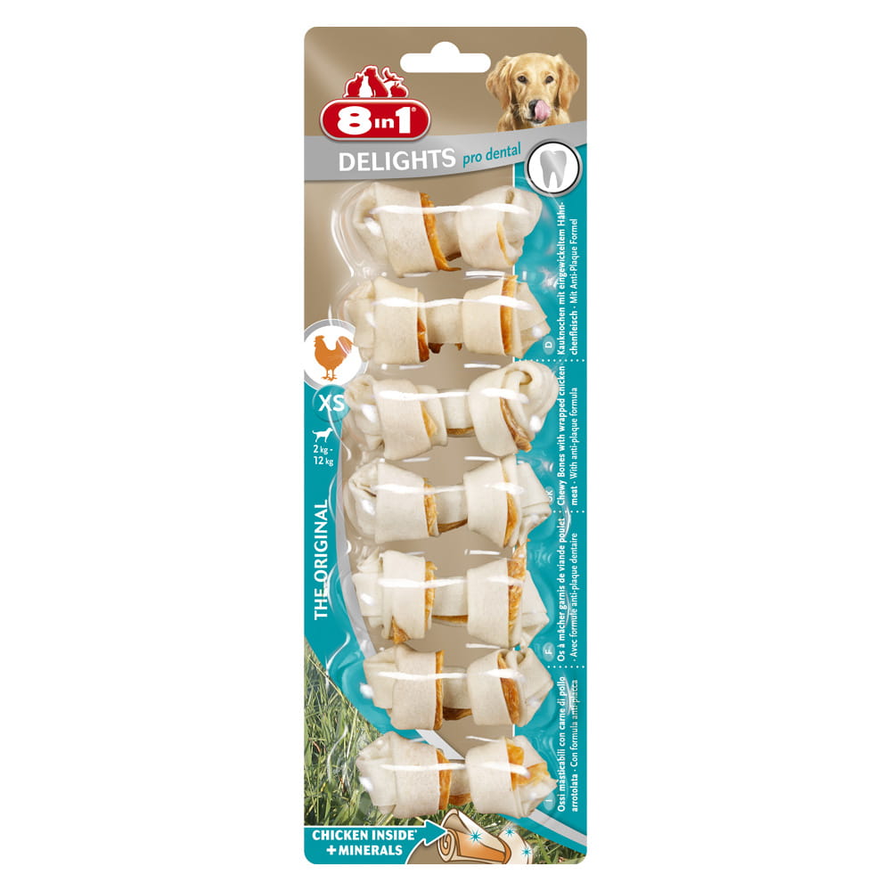 8in1 Delights Pro Dental to unikalne połączenie środka do pielęgnacji zębów, gryzaka oraz wyśmienitego przysmaku. Zawierają dużą porcję smacznego mięsa z kurczaka owiniętą twardą skórą wołową - z dodatkiem minerałów czyszczących zęby.