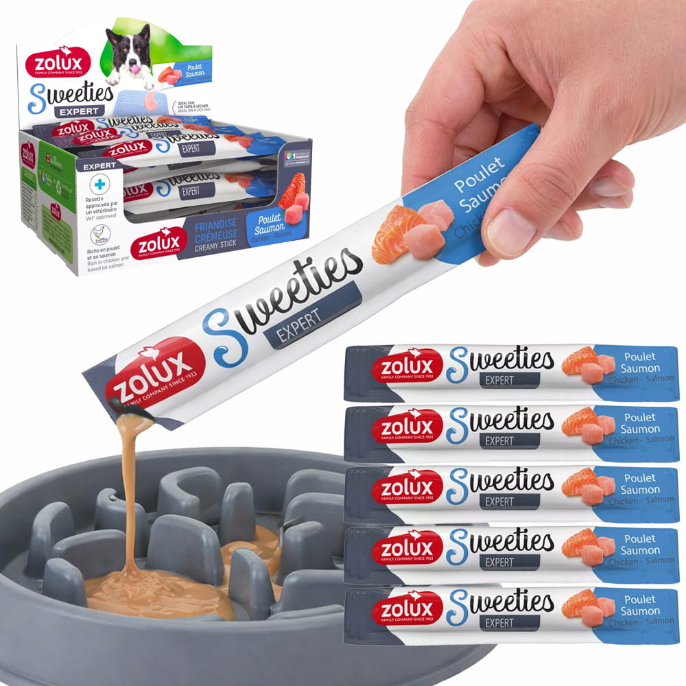 ZOLUX Sweeties, przysmak kremowy dla psa, łosoś i kurczak, zestaw 5x14g, nagroda dla psa, mata do lizaniaTagi produktu