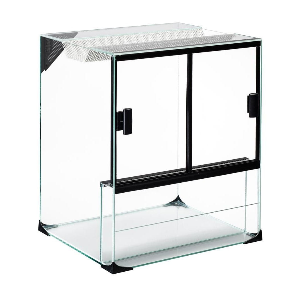 Terrarium 30x25x35cm wyposażone jest w system wentylacyjny, a także nową przelotkę na przewody kablowe. Przesuwne drzwi wraz z funkcyjnym uchwytem zapewniają wygodny dostęp do wnętrza. Wykonane są ze szkła Float charakteryzującego się wysoką przejrzystością, nie zaburzają postrzegania kolorów. Szkło to charakteryzuje się również wysoką wytrzymałością.